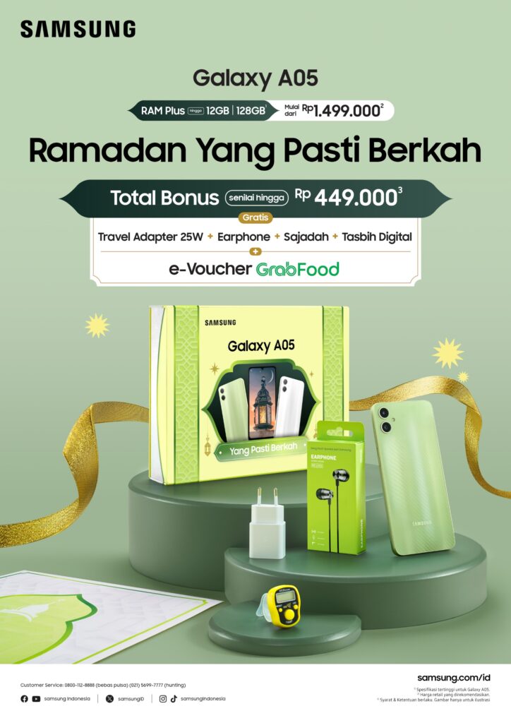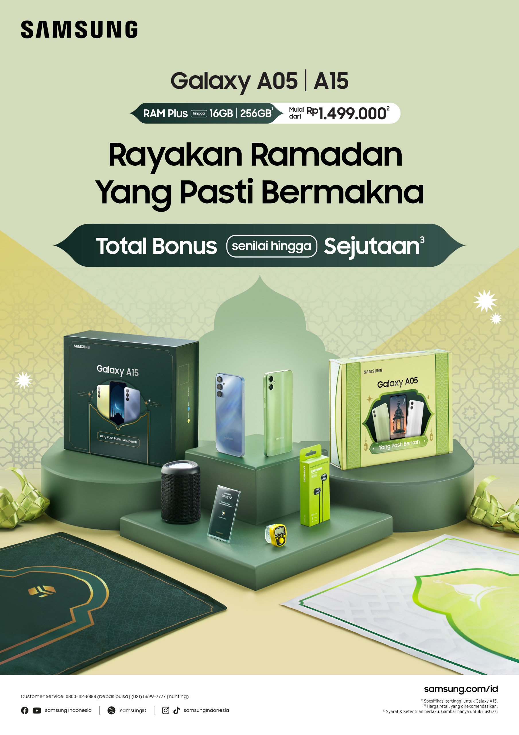 Spesial di bulan Ramadan tahun ini, mulai 11 Maret 2024 Samsung menyediakan paket bundling Ramadan Galaxy A15 berisikan smartphone, Travel Adapter 25W, speaker Bluetooth, logam mulia 0,025g ,sajadah travel, pre-load aplikasi Saalam, kartu ucapan Ramadan dan gratis 1 tahun proteksi total Samsung Care+. Adapun paket bundling Ramadan Galaxy A05 berisikan smartphone, Travel Adapter 25W, earphone, tasbih digital, sajadah travel, voucher GrabFood Rp50.000, kartu ucapan Ramadan serta pre-load aplikasi Saalam. Hanya dengan menambahkan Rp 100.000 dari harga smartphone yang dipilih, kamu dapat memperoleh tambahan benefit senilai hingga Rp 1.014.000.