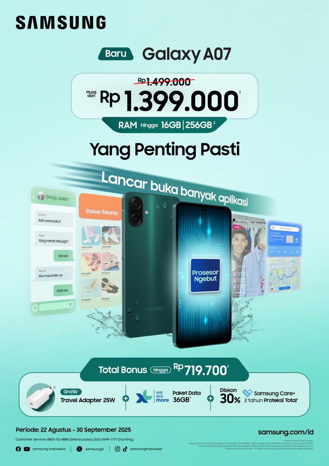 Terjangkau, tahan lama, dan trendi, Galaxy A07 menawarkan beragam pengalaman luar biasa untuk aktivitas sehari-hari. Galaxy A07 tersedia di toko-toko Samsung terdekat dalam pilihan warna Green, Light Violet, dan Black, pada harga Rp. 1.399.000 (4/64GB), Rp.1.649.000 (4/128GB), Rp.1.949.000 (6/128GB) dan Rp.2.299.000 (8/256GB). Dapatkan total bonus pembelian senilai hingga Rp.719.700 berupa bundling travel adapter 25W, paket data XL 36GB, dan diskon 30% Samsung Care+ untuk 1 hingga 2 tahun proteksi total.